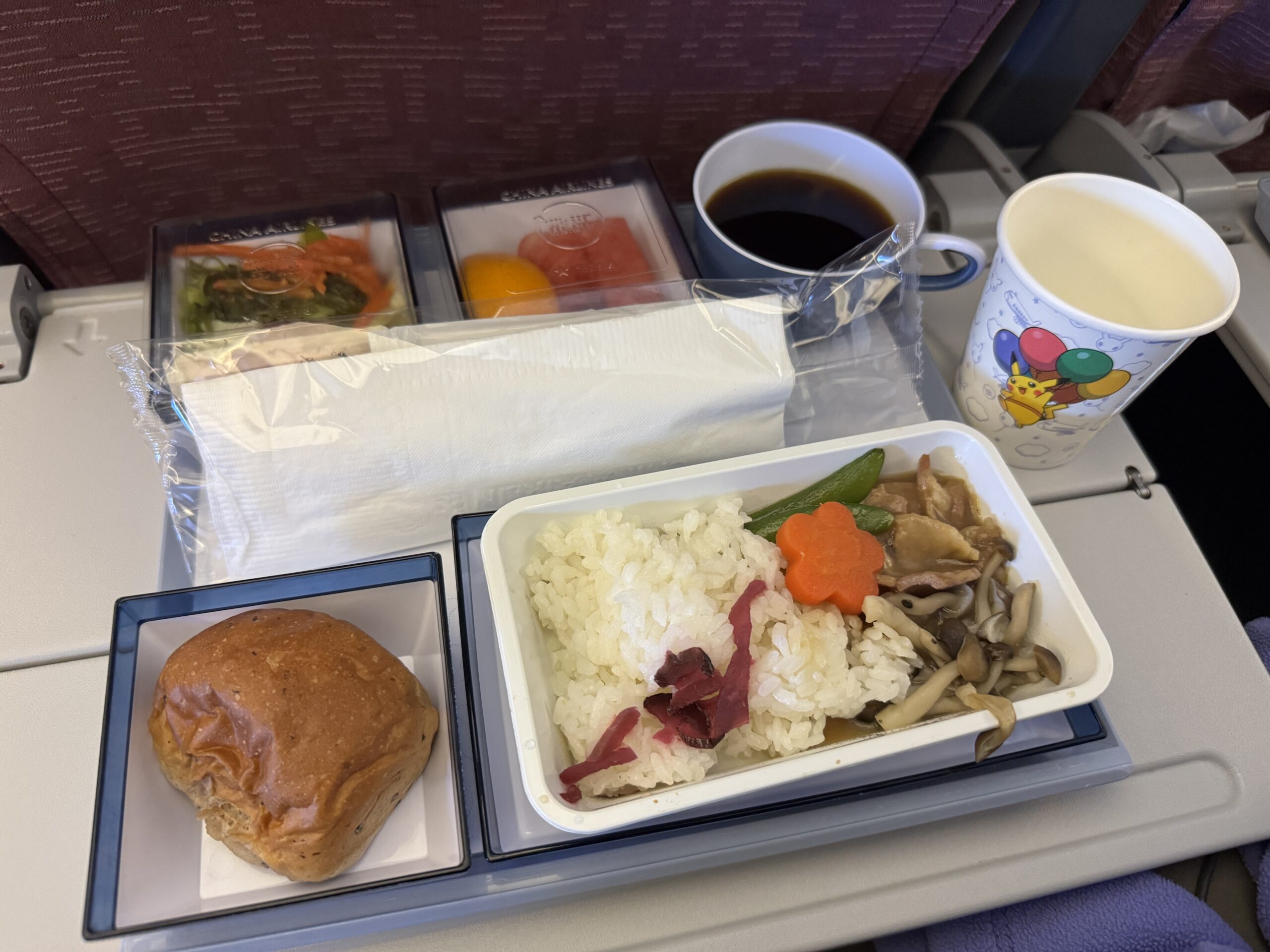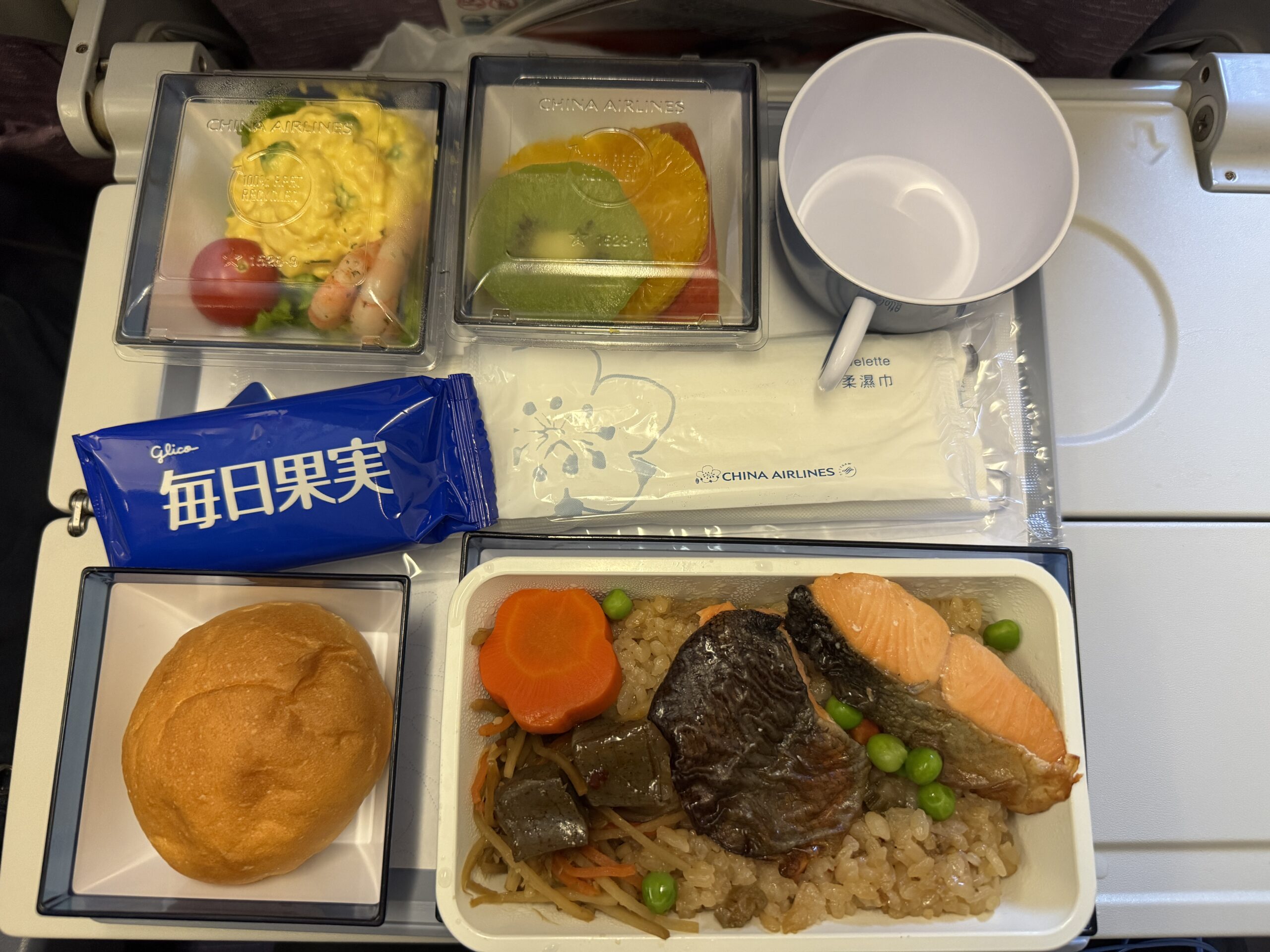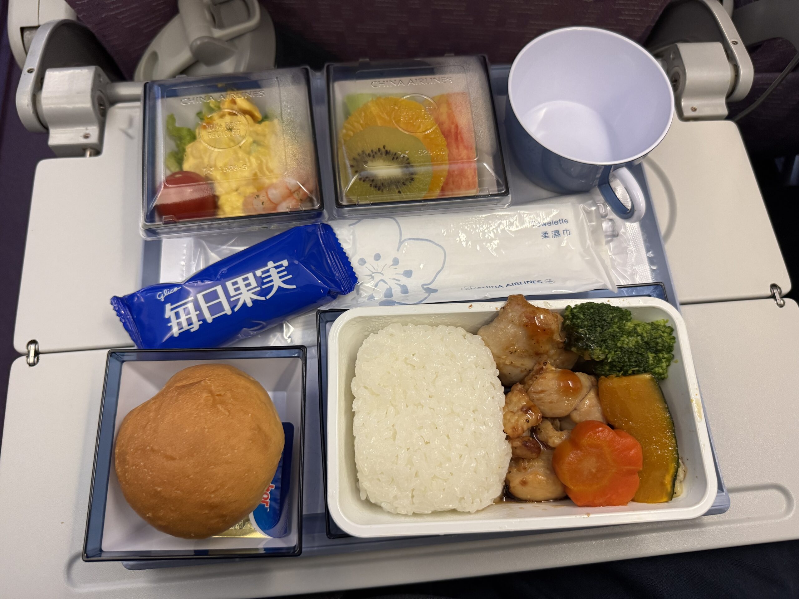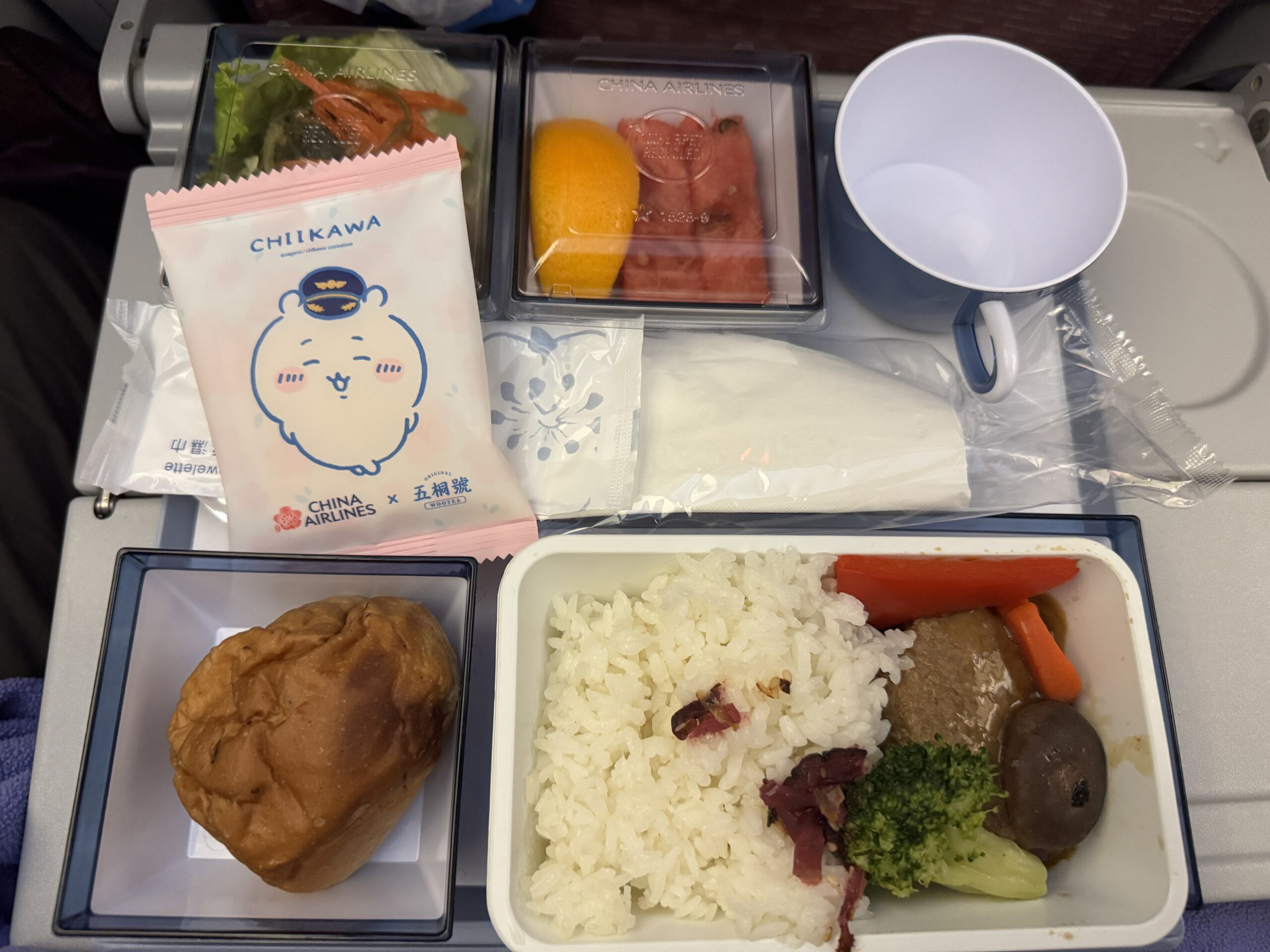 這次來回都是坐華航,剛好都遇到吉伊卡哇的聯名期間,雖然華航可以是先選擇餐點,但據網友回饋,正常配的餐點其實比較好吃,我們選的一個是薑汁豬肉、伊個是漢堡排,我覺得都中規中矩,不是特別好吃,但也不會到特別難吃,大概就及格這樣,不過解了一點餓,還是不錯啦。