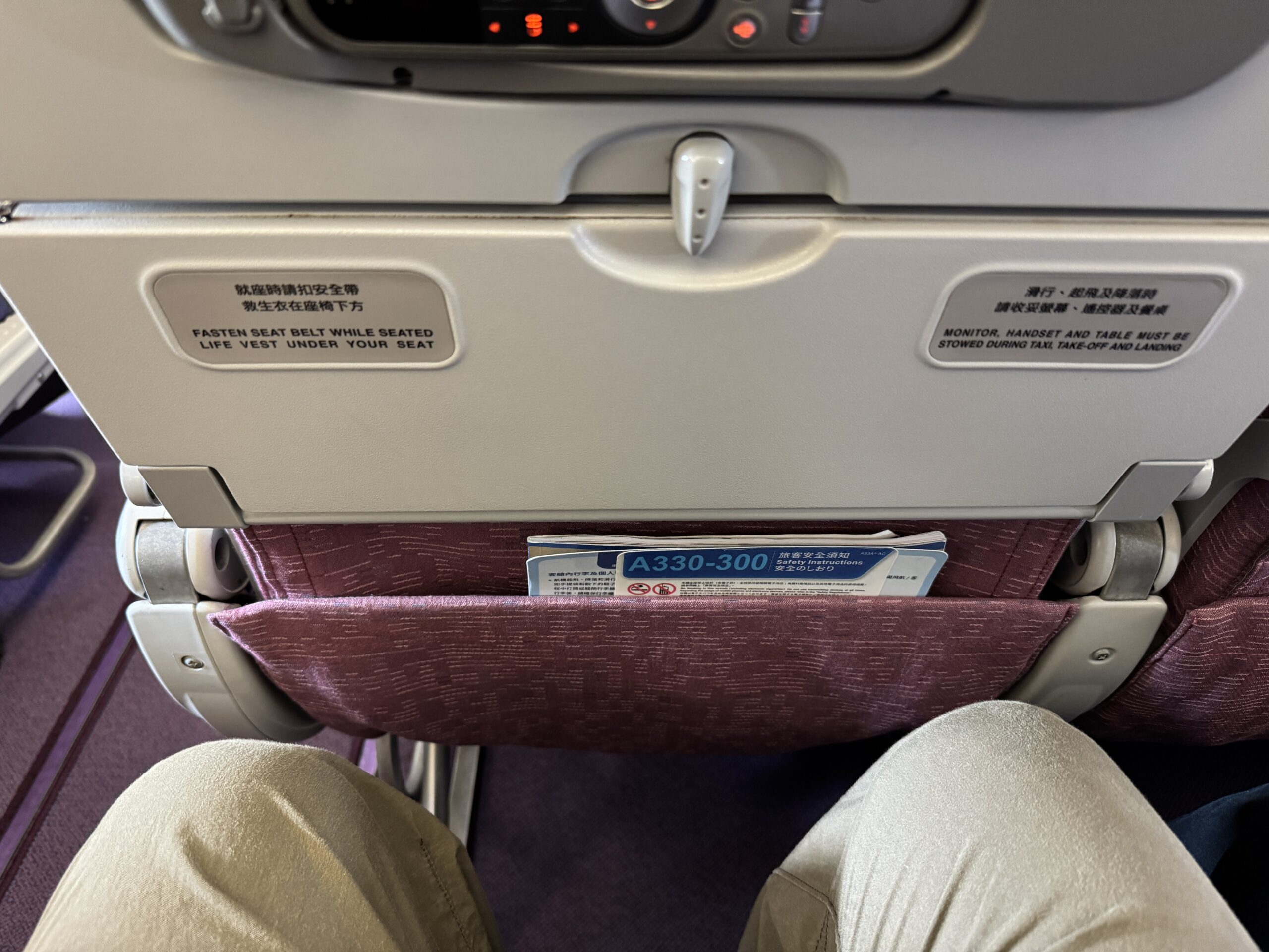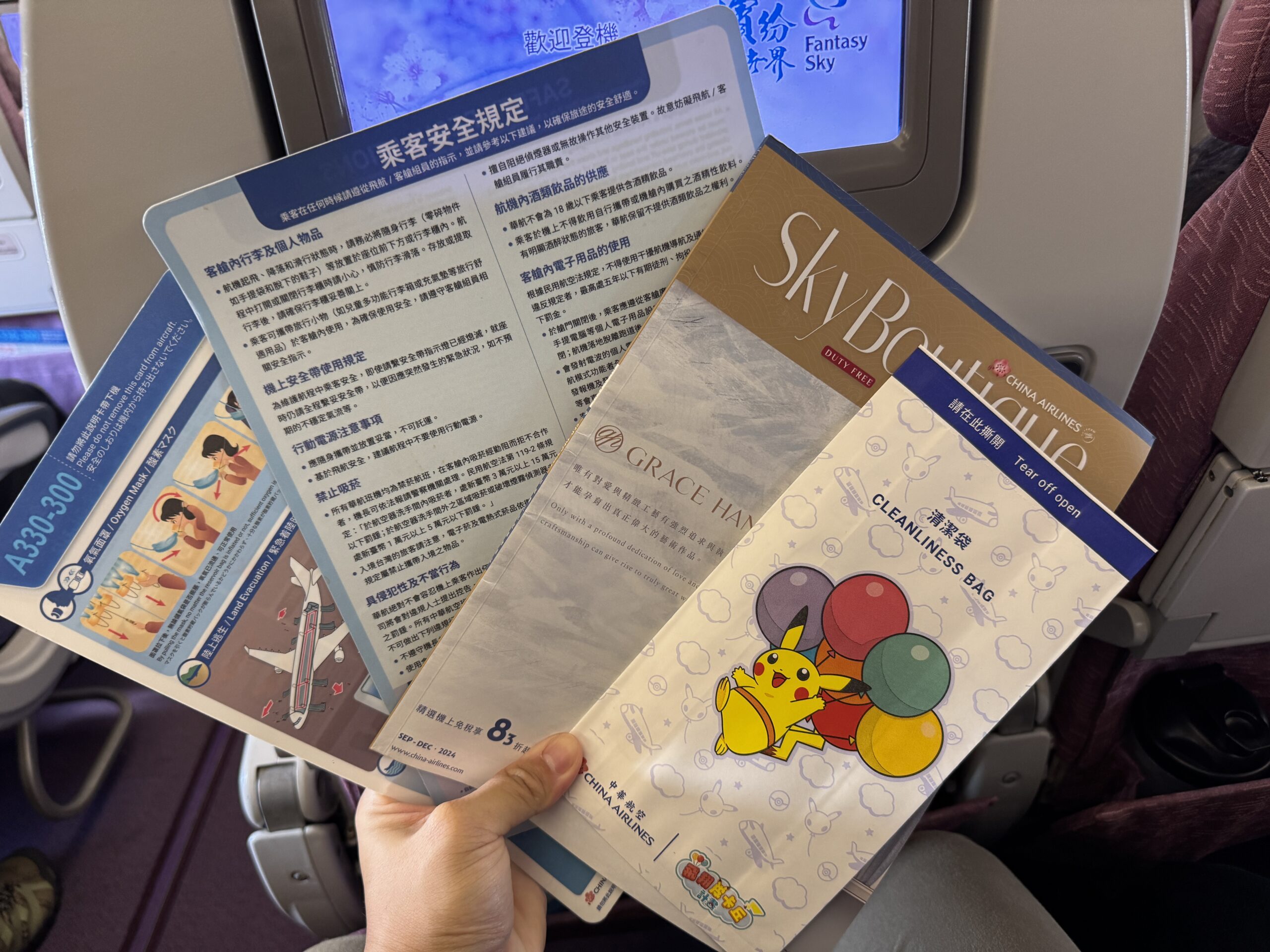 位置挺寬的,176成年男性的我,還不會碰到前面的椅子,然後前面有一些安全守則、飛機資訊跟皮卡丘清潔袋(皮神粉的我XD這個我拿了超多回家)