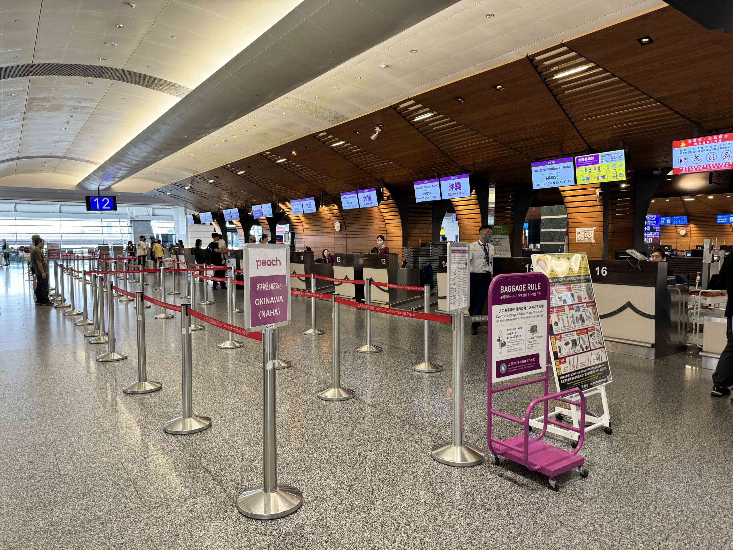 樂桃航空在桃園機場第一航廈12櫃的位置,從機場捷運出來的我們,真的是從第一櫃走到最後一櫃才到辦理區..真的很遠。樂桃航空可以隨身兩件行李共七公斤的手提上機。