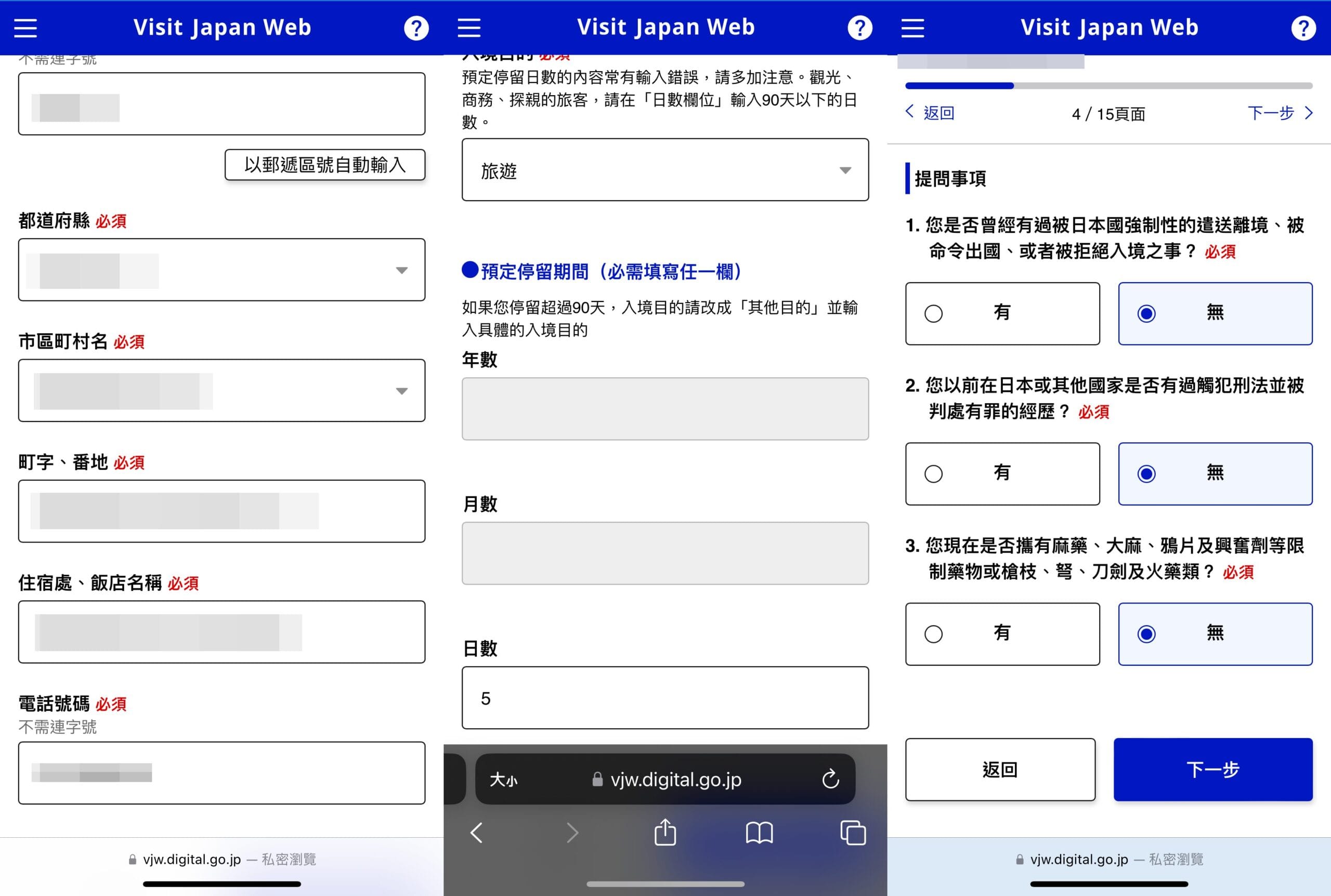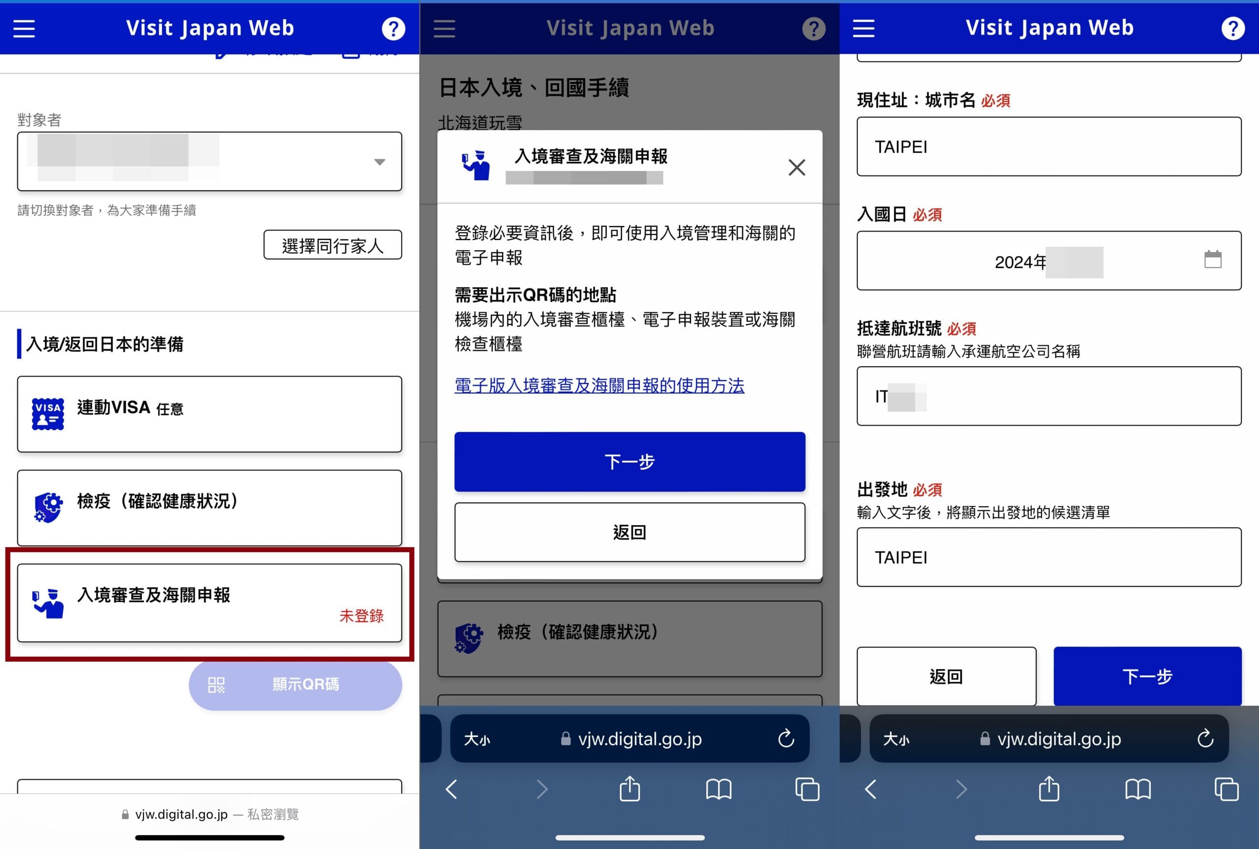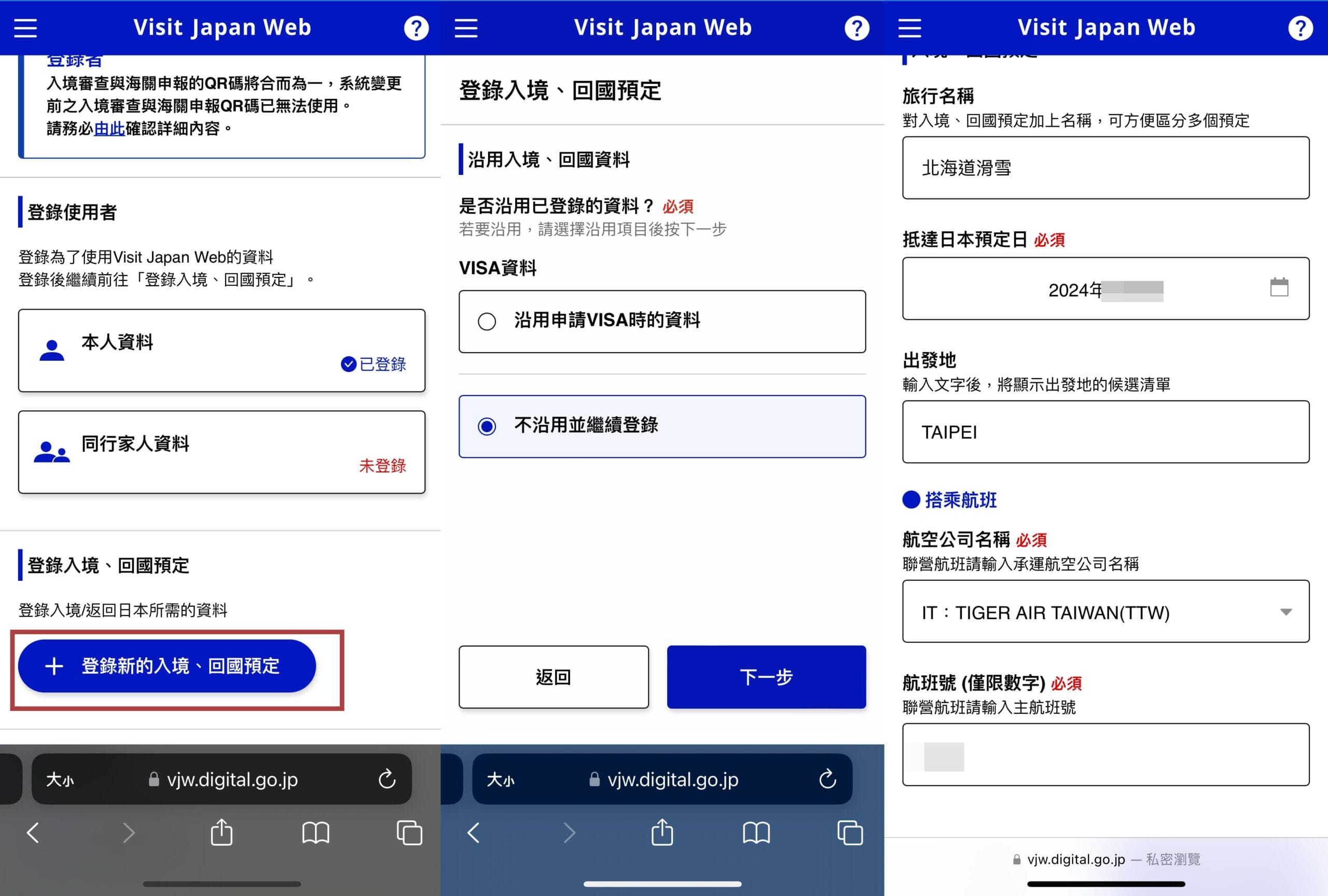 個人資料登錄完成後,接著要開始填寫入境日本的時間、地點等相關內容,方法也很簡單照著流程走就沒問題