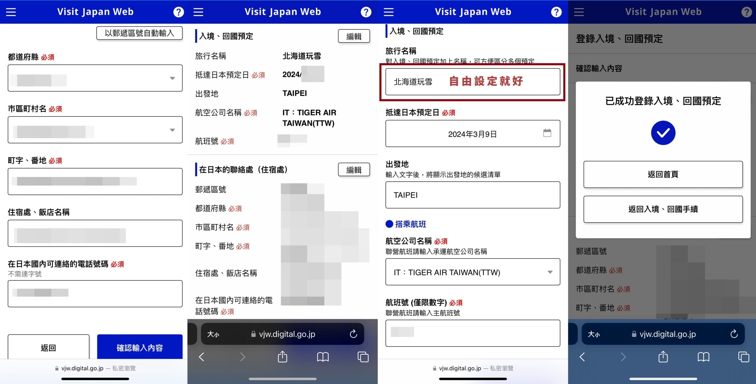 這邊會需要填寫航班資訊,至於旅行名稱那邊可以自由地寫想要的名稱,主要是好分辨是哪次到日本,因為可能會有人有多次進出日本的需要