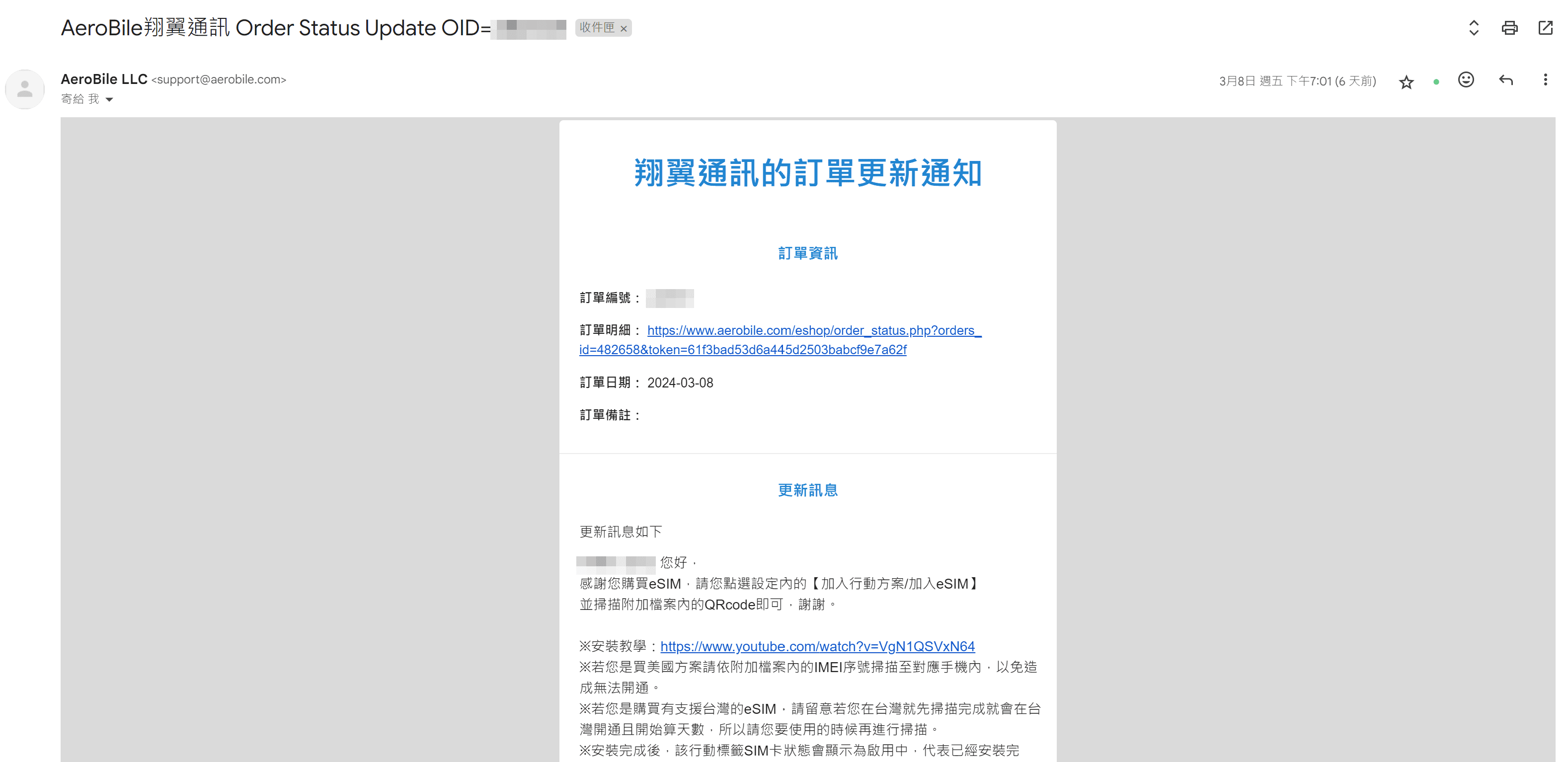 因此馬上又再翔翼通訊的網站上下單eSIM-日本5G極速飆日卡,很快地就收到客服的訂購信件。