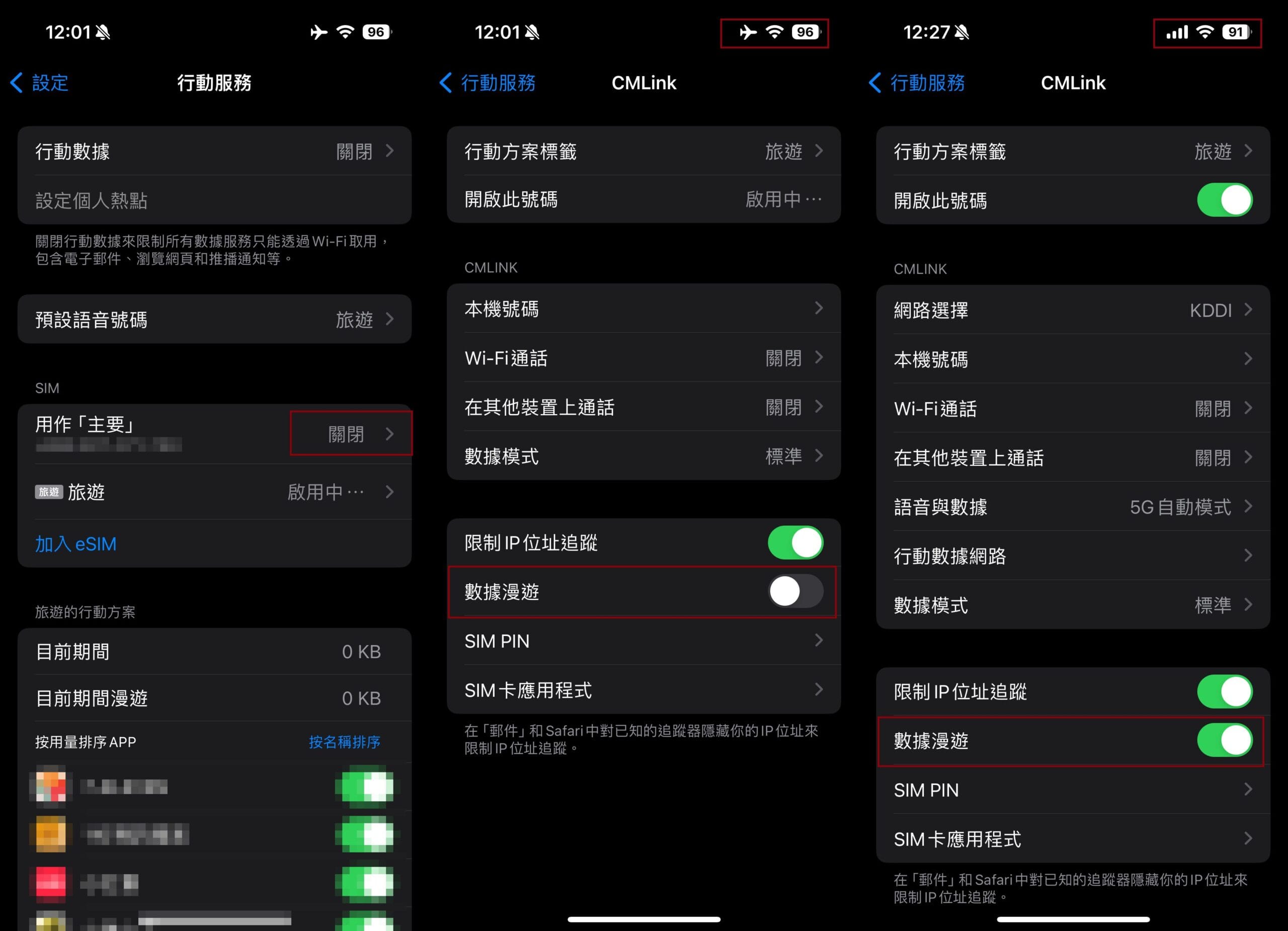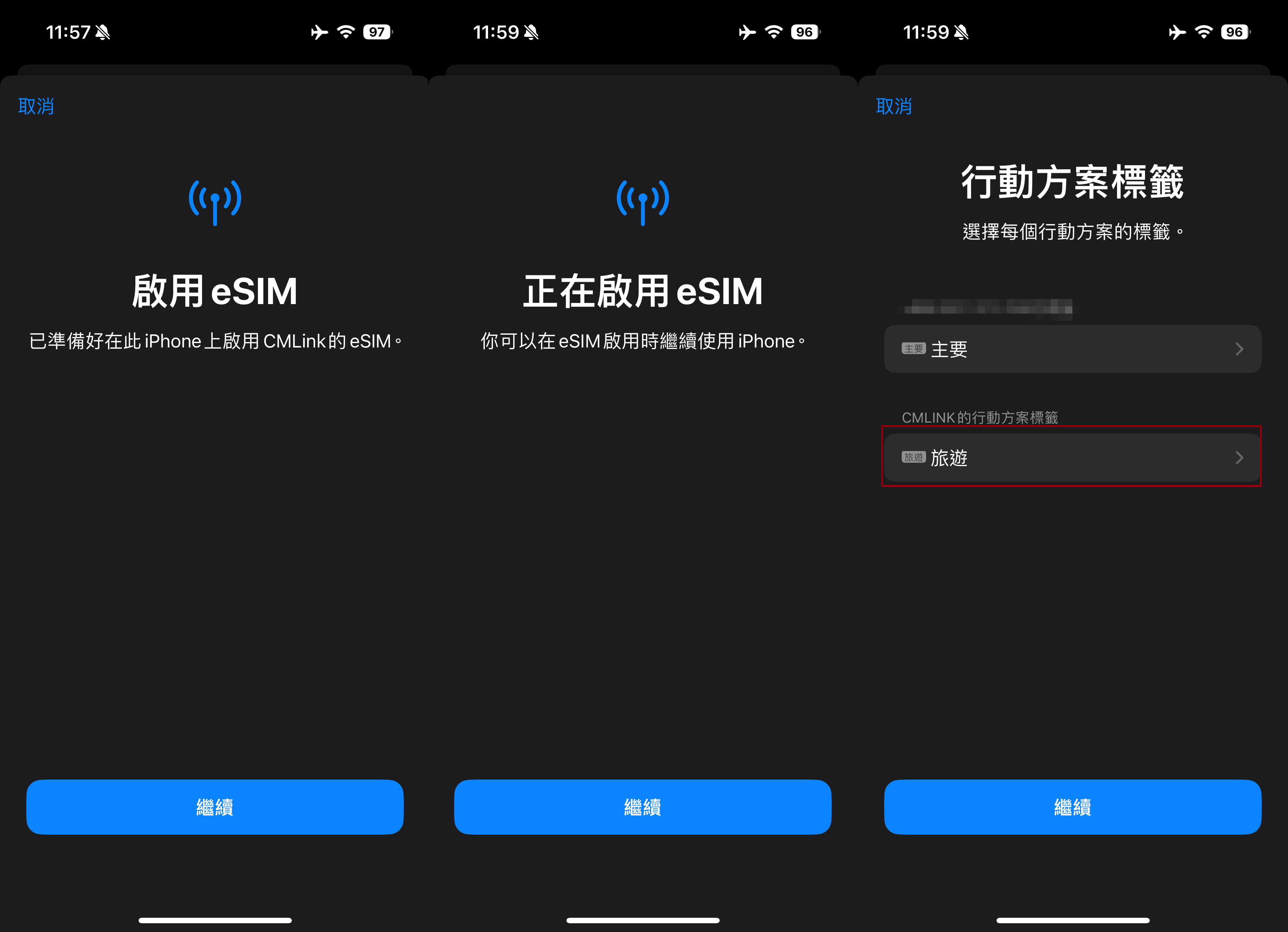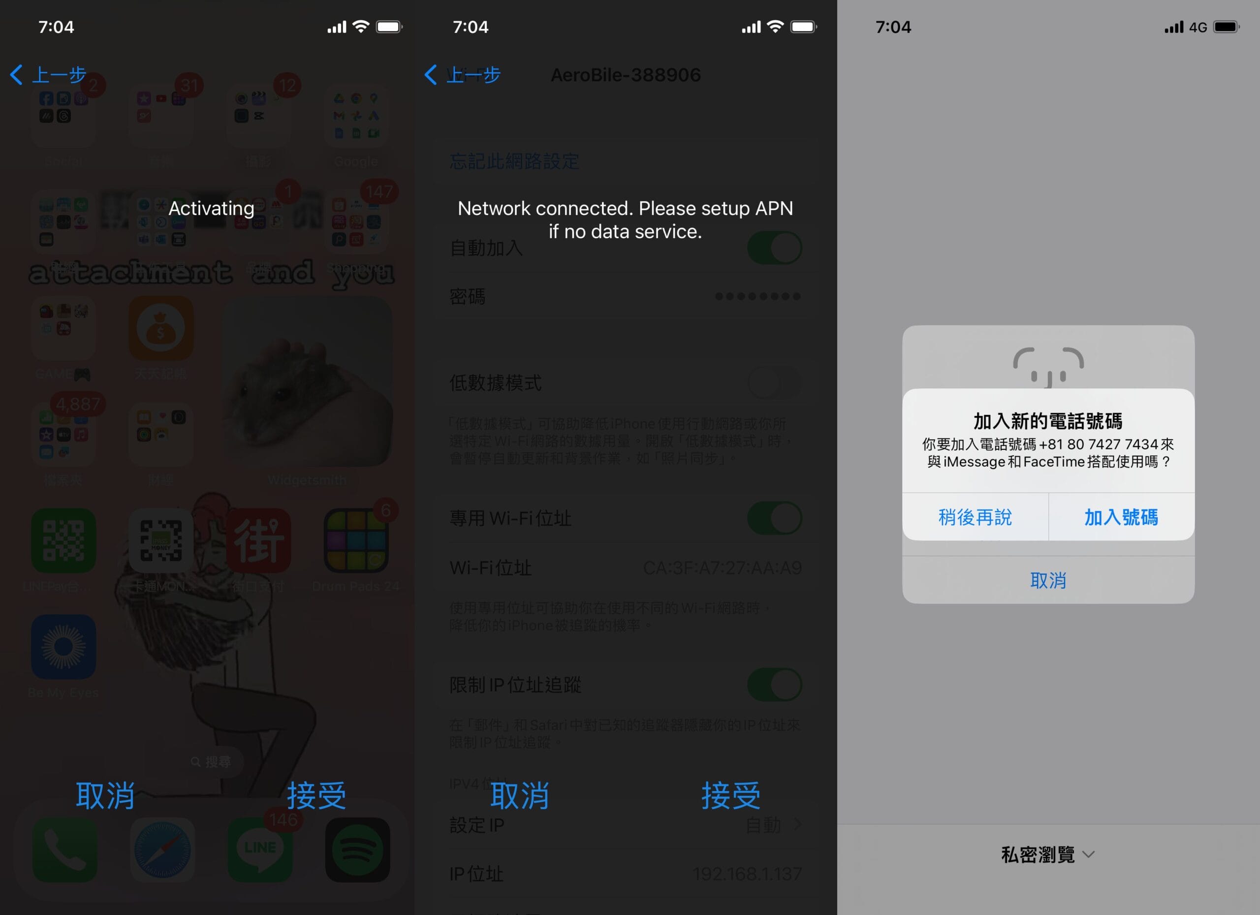 接著會跳出啟用中的選項,這時要注意要把自己原先的SIM卡按關閉,接著把飛航模式關掉,並且開啟數據漫遊,這樣就可以連線上了。
