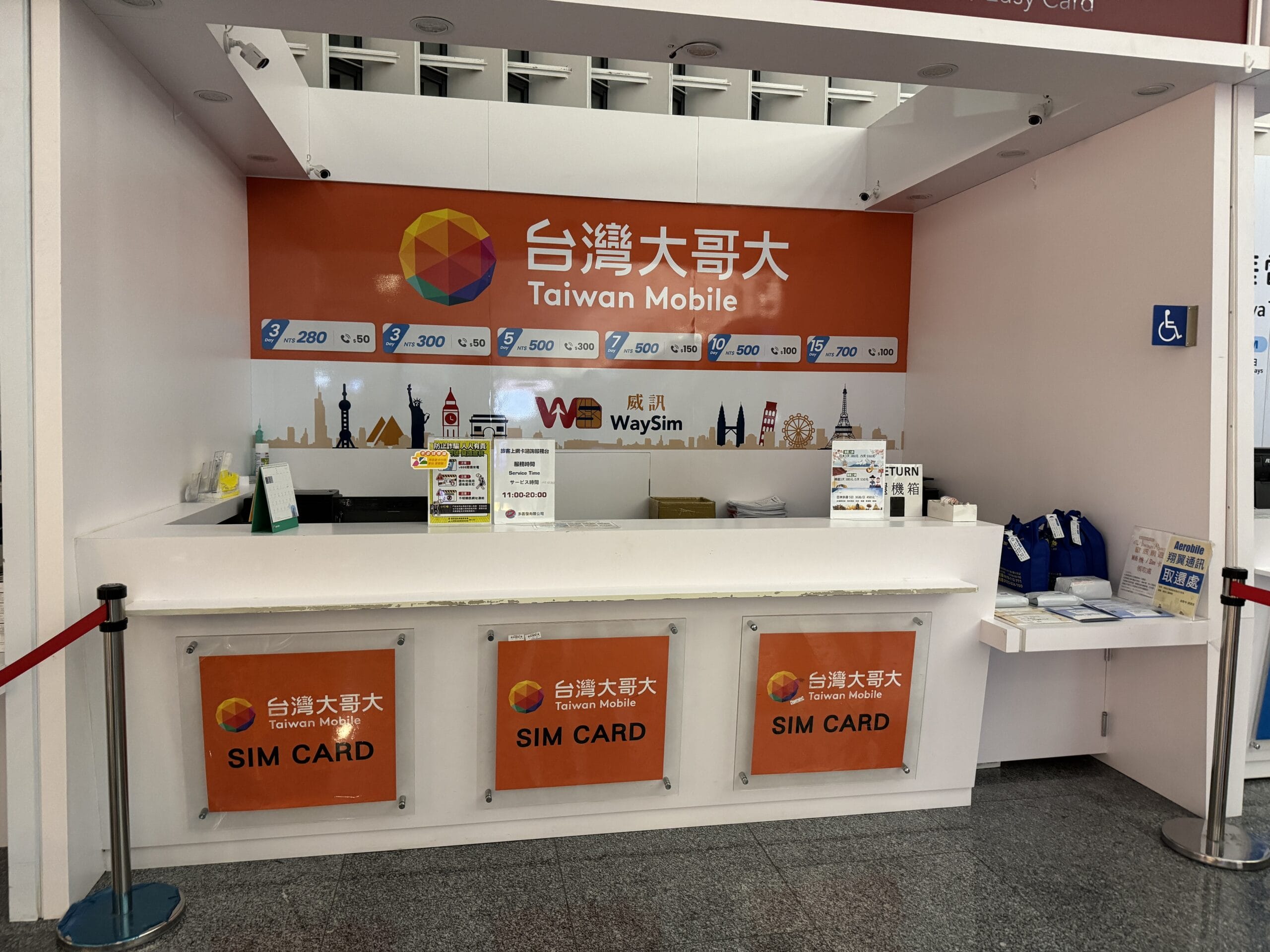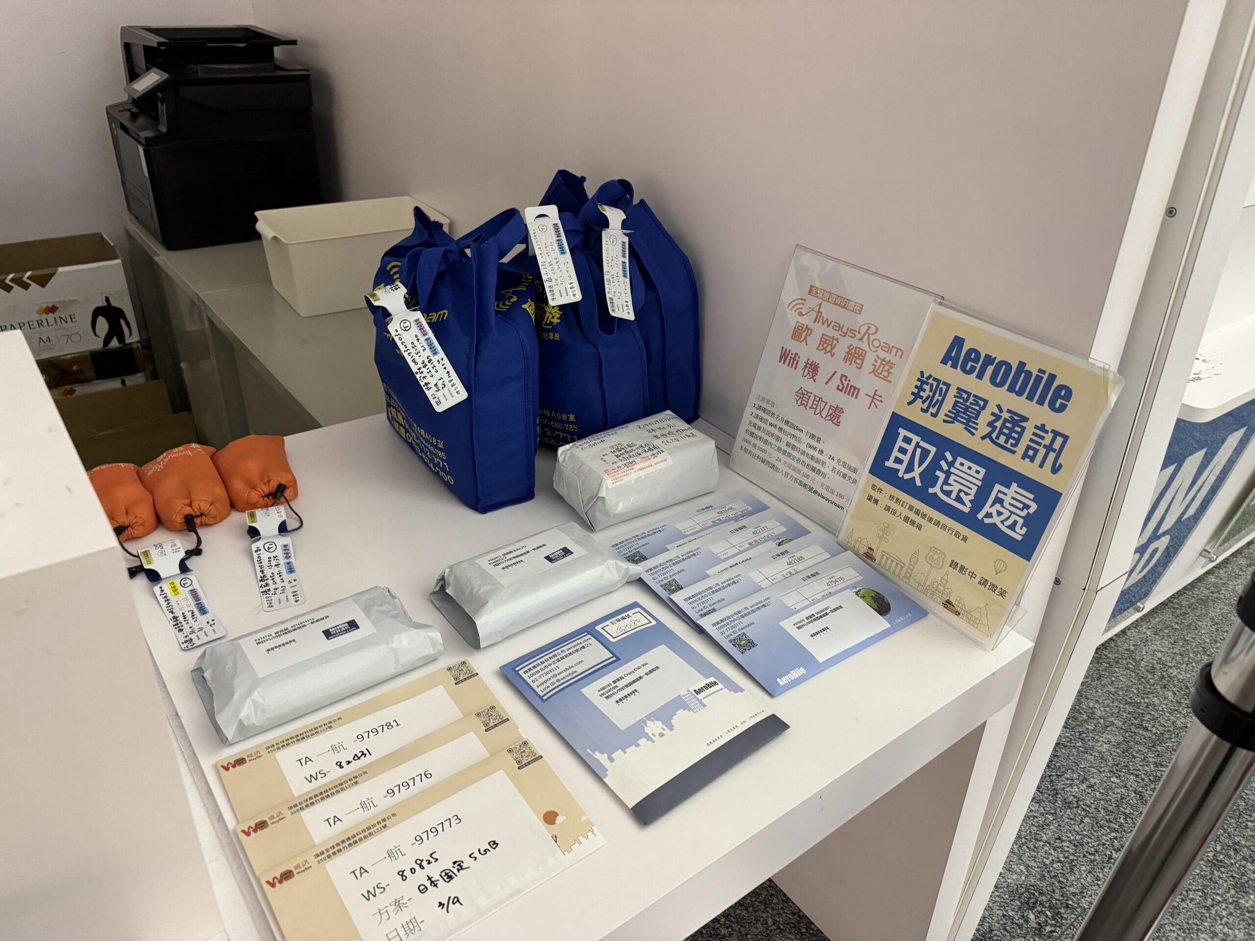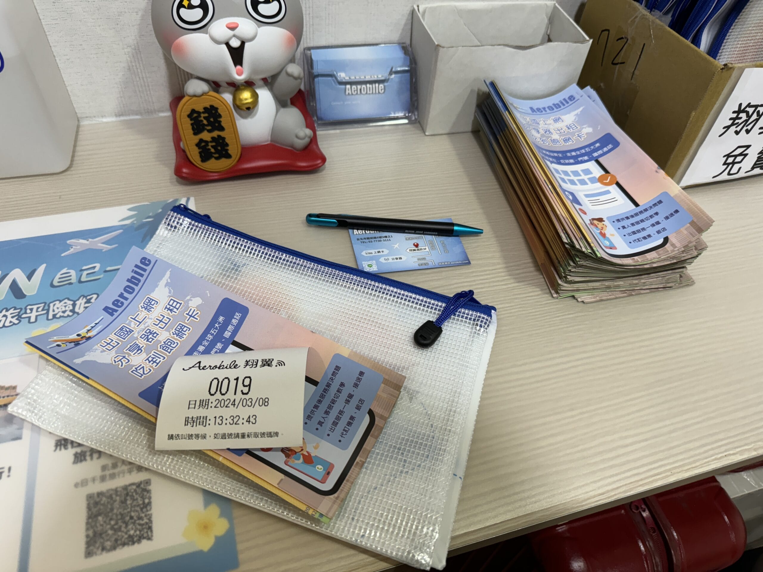 如果是選擇到機場取貨,也可以到第一航廈或者第二航廈部份取網卡或機器。以第一航廈為例子,雖說翔翼沒有正式的櫃位,但有跟台灣大哥大櫃台配合,地點在出境大廳門口出來後左手邊直走就看到了。